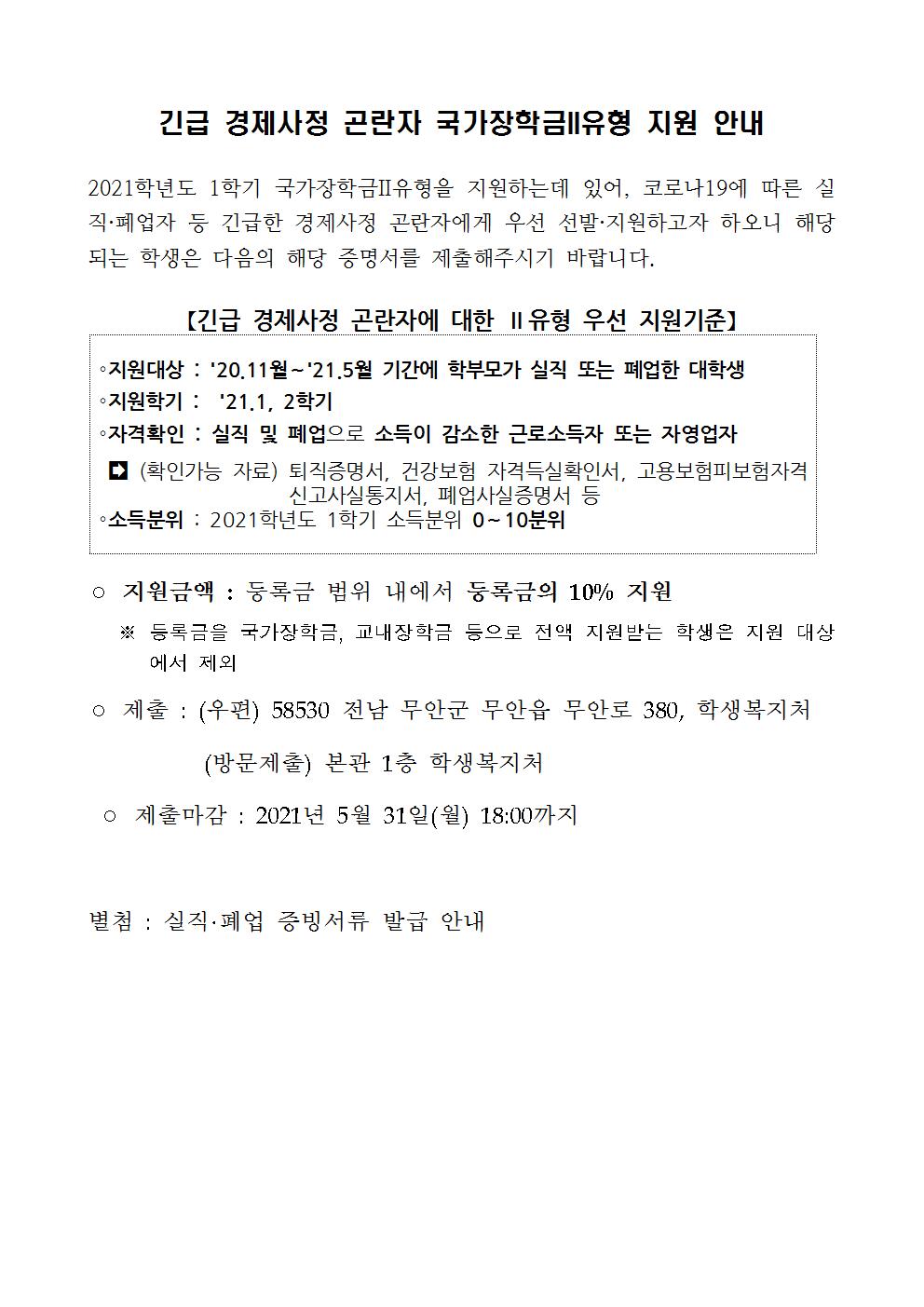 2021학년도 1학기 긴급경제사정곤란자 국가장학금II유형 지원 안내