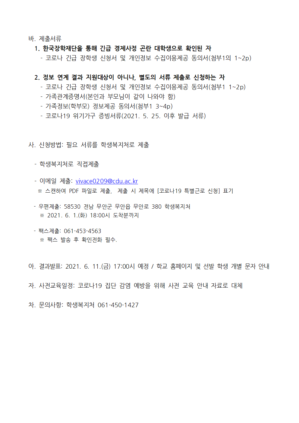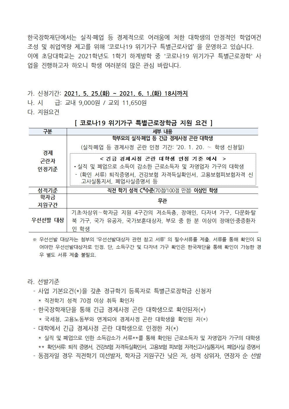 2021학년도 코로나19 위기가구 특별근로장학금 신청 및 선발 안내