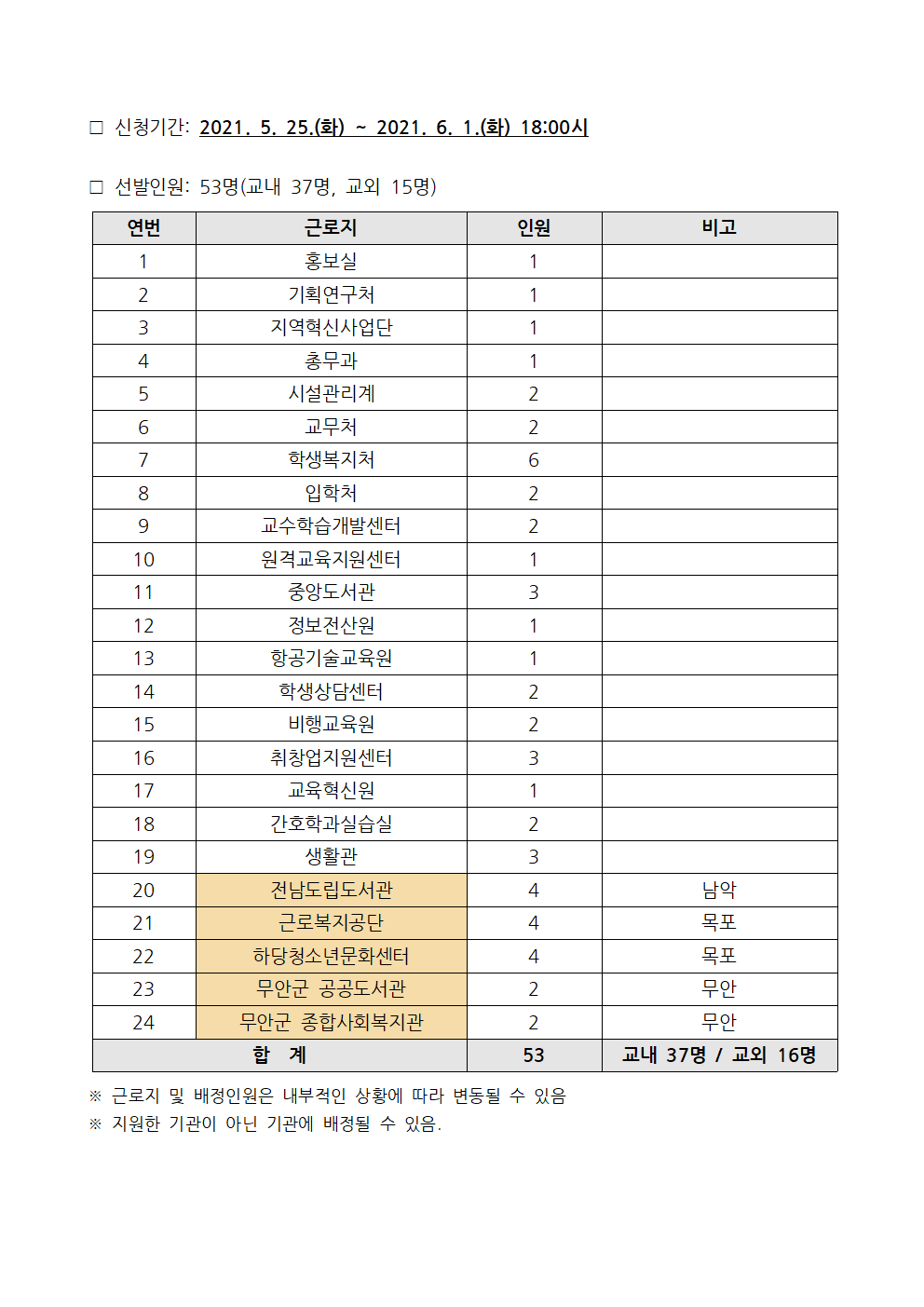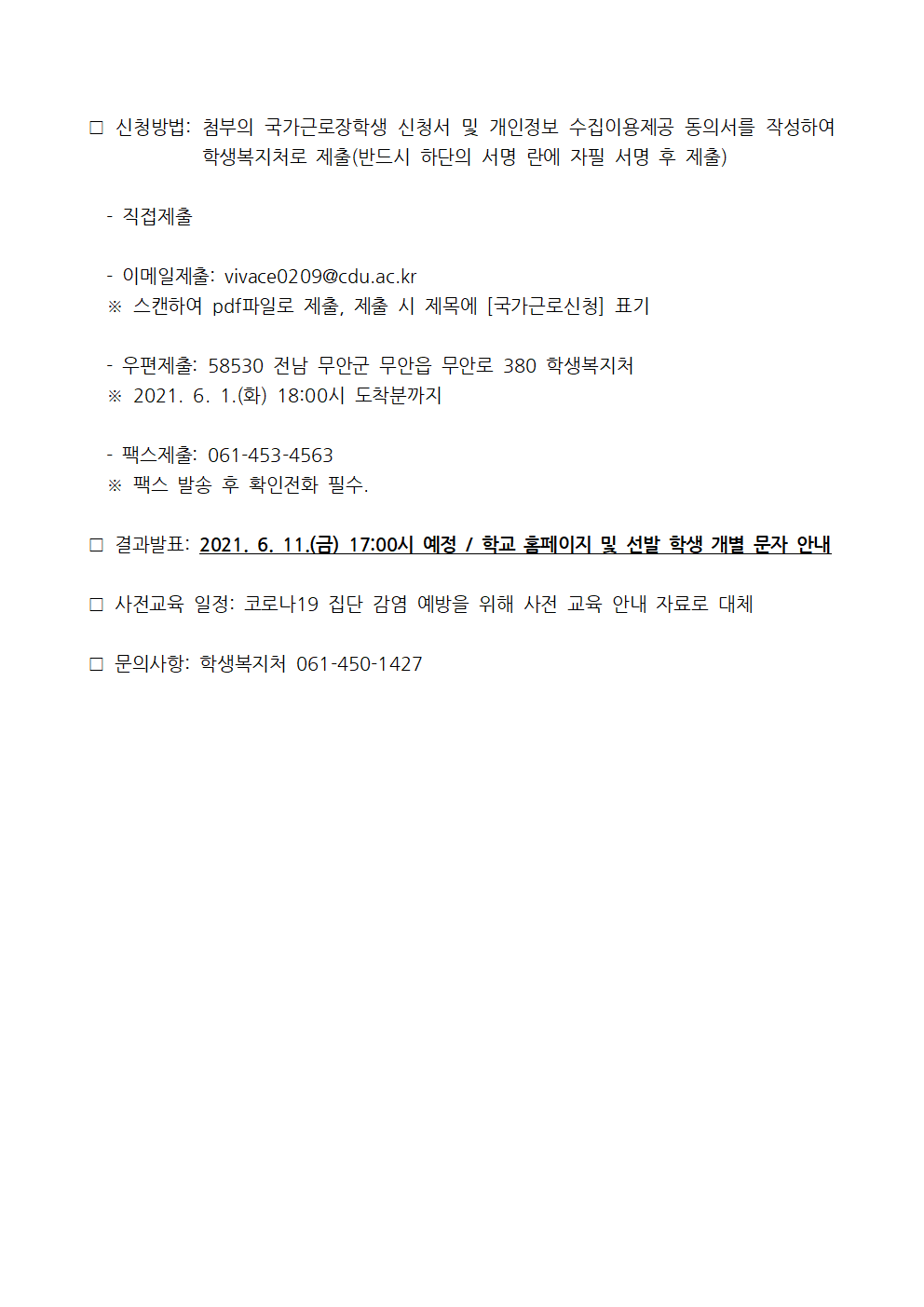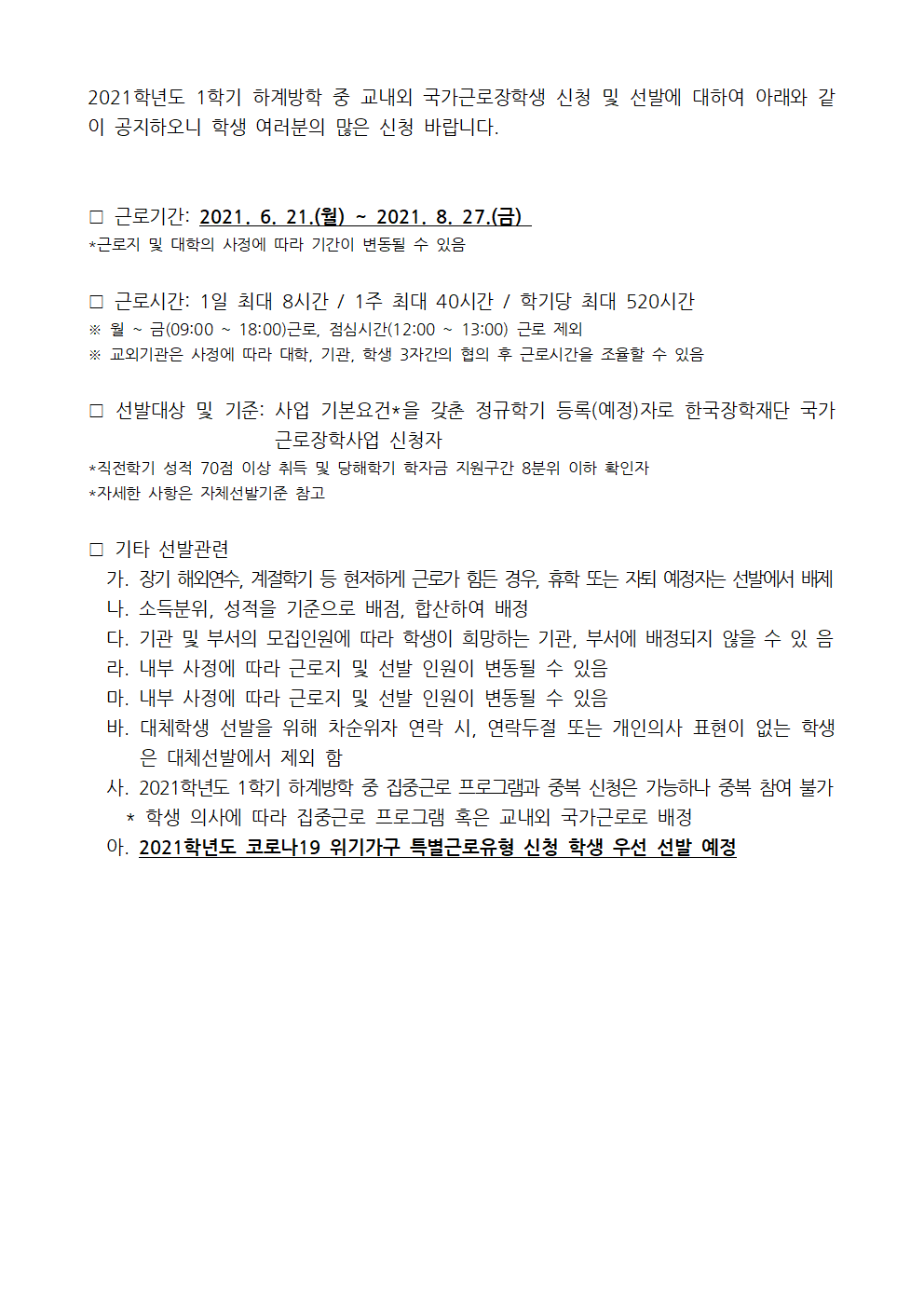 2021학년도 1학기 하계방학 중 교내외 국가근로장학생 신청 및 선발 안내