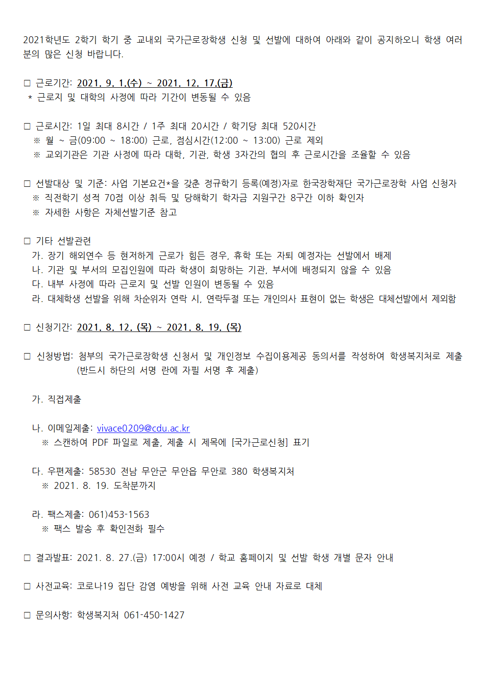 2021학년도 1학기 하계방학 중 교내외 국가근로장학생 추가 신청 및 선발 안내